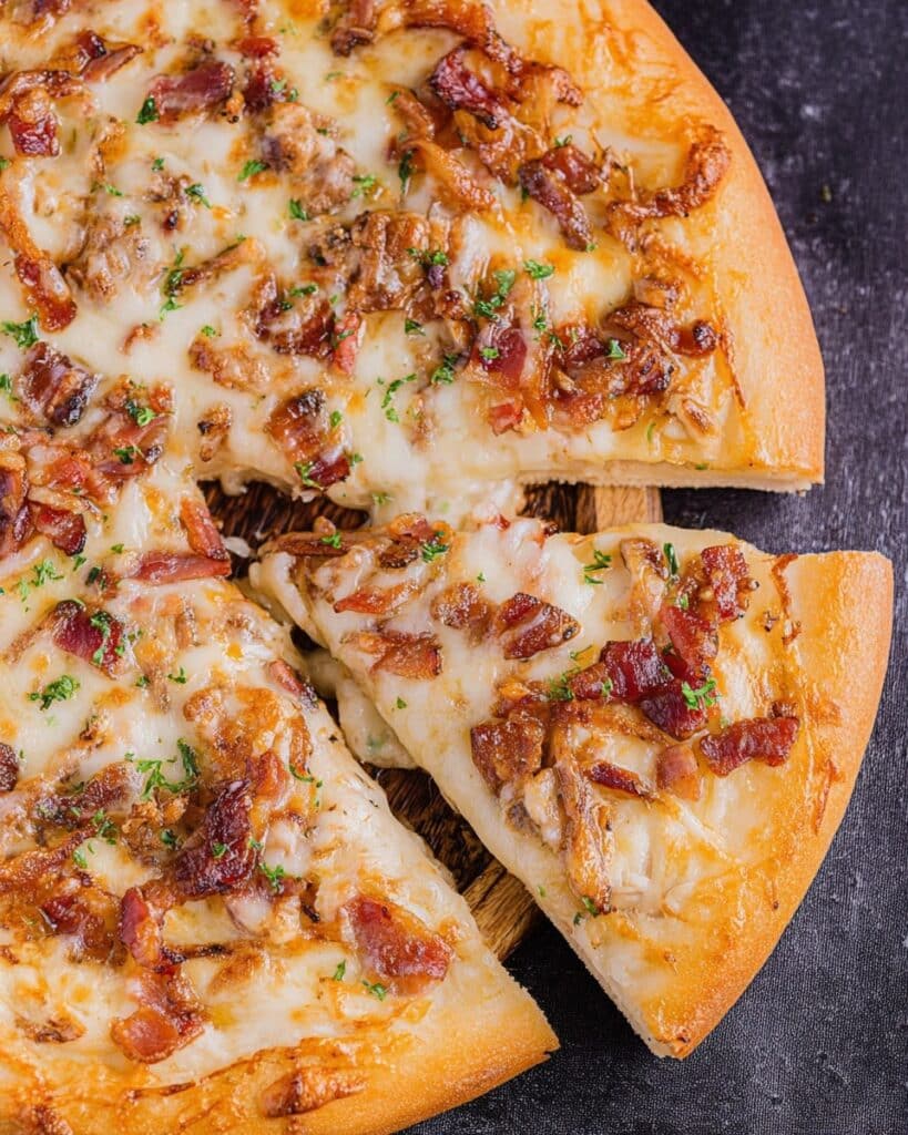 This isn’t just another pizza—it’s comfort food at its finest. The creamy alfredo makes every bite rich and satisfying, while the bacon adds that irresistible crunch and smokiness. Plus, it’s super versatile. You can dress it up for a dinner party or keep it casual for a family pizza night.