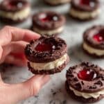 Delight in the festive spirit with these Black Forest Cookies featuring a tender cocoa dough filled with luscious cherry jam and creamy white chocolate ganache. Enhanced with the optional splash of cherry schnapps and topped with rich melted chocolate and dark chocolate sprinkles, these cookies capture the classic flavors of the Black Forest in a perfect holiday treat.