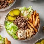 - Assemble the Burger Bowls: In serving bowls, start with a base of roasted potatoes. Top with seasoned beef mince, shredded lettuce, cheese slices or shreds, and pickle slices. Drizzle with the homemade burger sauce as desired. Serve immediately and enjoy a flavorful and hearty burger experience without the bun.
