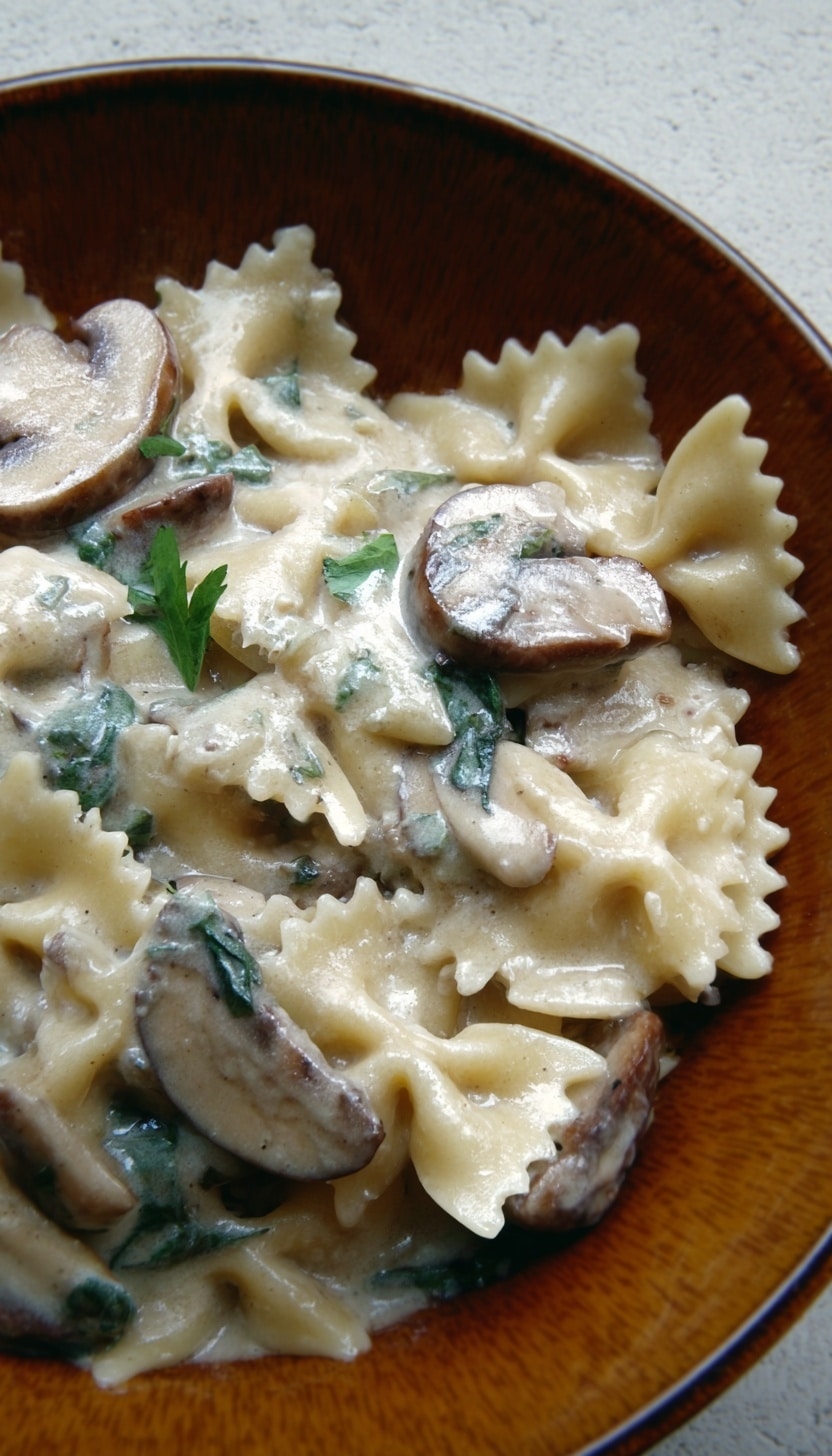 A rich, comforting pasta dish featuring bow tie (farfalle) pasta tossed in a silky cream sauce with sautéed mushrooms, sweet leeks, garlic, and Parmesan. Butter and olive oil develop a deep flavor, and fresh herbs brighten the dish. Perfect for cozy dinners or impressing guests.
