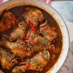 Dominican Stewed Chicken, or Pollo Guisado, is a flavorful and comforting one-pot dish featuring tender chicken pieces simmered in a richly seasoned sauce with bell peppers, onions, olives, and fresh cilantro. This traditional Dominican recipe balances savory, tangy, and slightly sweet flavors, making it a perfect main course served alongside rice or plantains.
