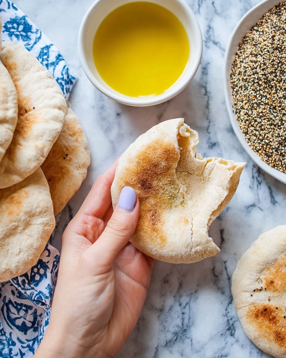 I love brushing fresh pitas with a little olive oil and sprinkling flaky sea salt or za’atar right after baking. It adds a fragrant layer that makes each bite special—plus, it’s super simple to do!