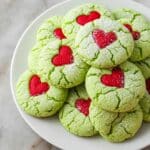 These Grinch Cake Mix Cookies are a fun, festive twist on classic cookies using a vanilla cake mix base. Enhanced with green food coloring for a vibrant holiday look and coated with powdered sugar and cornstarch, these soft, chewy cookies are perfect for Christmas celebrations. Topped with candy hearts or sprinkles, they bring both whimsy and sweetness to your holiday cookie platter.