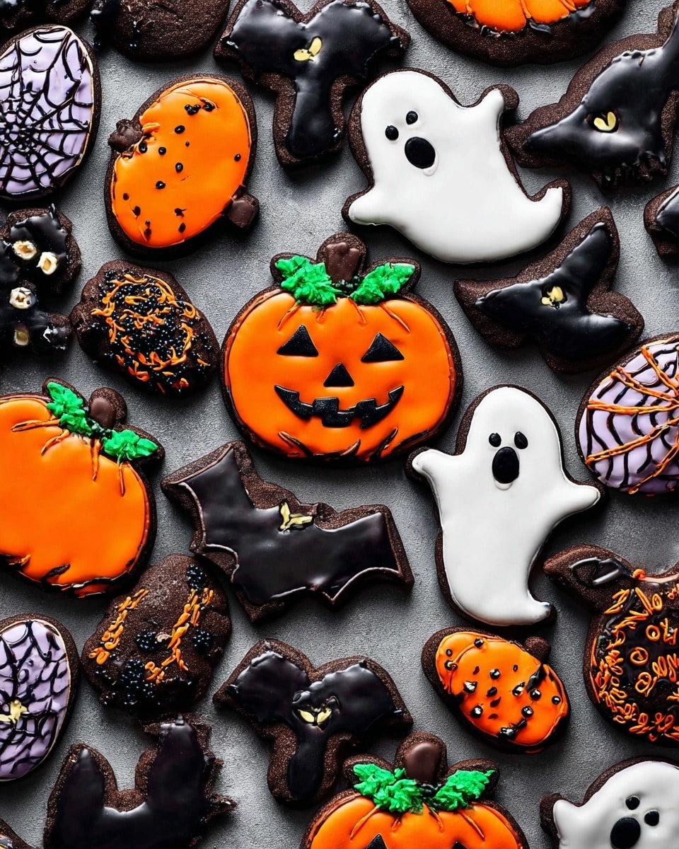 Keywords: Halloween cookies, chocolate cookies, royal icing cookies, festive treats, Halloween dessert, cocoa cookies