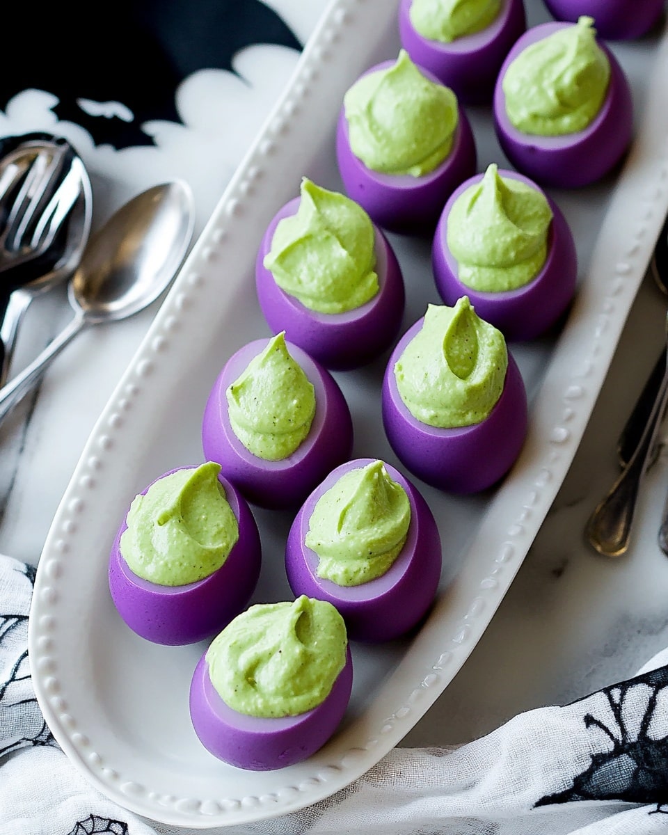 Keywords: Halloween deviled eggs, avocado deviled eggs, spooky party appetizers, holiday snacks, colorful deviled eggs