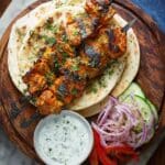 For parties, I like to serve these kebabs on a wooden board lined with banana leaves or parchment paper, surrounded by colorful bowls of chutneys, sliced onions, and lemon wedges—it makes for a festive look that’s perfect for sharing. You can also thread the chicken with peppers and onions for a colorful kebab skewer presentation that’s sure to impress guests.