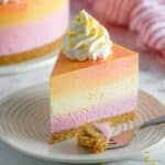 A vibrant and fun Layered Jello Pie featuring colorful layers of red, orange, and yellow jello set in a buttery graham cracker crust, topped with fluffy whipped cream and optional gold sanding sugar for a festive finish. Perfect for summer parties and family gatherings.
