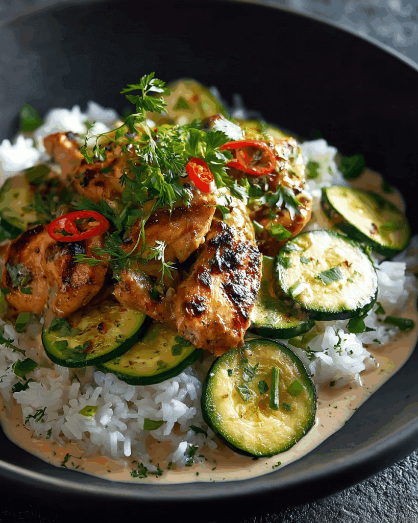 Plate the rice, top with sliced chicken and zucchini, and garnish with fresh herbs and lime wedges. Take a deep breath and enjoy—it smells amazing.