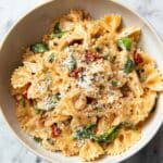 For a special occasion, I’ve plated this Marry Me Chicken Pasta Recipe in shallow bowls with a fresh basil sprig in the center and scattered sun-dried tomato strips on top. Setting the table with candles and good wine really elevates the experience and makes your dinner feel extra memorable.