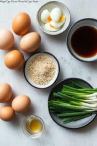 All these ingredients come together to create that delicious sweet and savory soak that defines Mayak Eggs. Each component plays its part in building flavor—think balance between salty soy sauce, sweet honey rice syrup, and the fresh aromatics like garlic and onion.