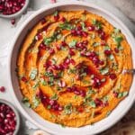 I always love sprinkling fresh pomegranate seeds and chopped parsley on top of my Muhammara recipe. The seeds add a pop of color and a sweet burst that contrasts nicely with the smoky dip, while parsley adds a fresh, herby flavor and a touch of vibrancy.