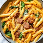 For a special dinner, I’ve served this pasta in individual cast-iron skillets, garnished with parsley and a few extra sausage slices on top. It’s a fun way to make a simple dish feel a bit fancy without much extra effort. Adding a drizzle of hot honey on top also adds a surprising sweet-spicy twist my guests always enjoy.