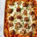 Keywords: one pot meal, meatballs, baked pasta, easy dinner, weeknight recipe, marinara sauce, mozzarella cheese