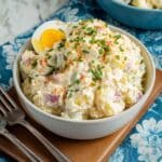 I don’t recommend freezing this potato salad because mayonnaise and boiled eggs can change texture and separate upon thawing. For the best texture and flavor, stick to making it fresh or enjoying leftovers within a few days.