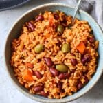 Once the rice is cooked through, stir in the rinsed kidney beans and halved green olives (if using). Cover for another 5 minutes to warm everything through and meld the flavors. Then take off the heat and let it sit for a few minutes—I find the flavors deepen beautifully with a short rest.