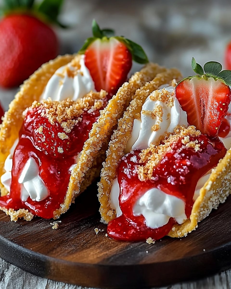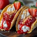 Keywords: strawberry cheesecake tacos, no-bake dessert, graham cracker tacos, creamy cheesecake, fresh strawberry dessert