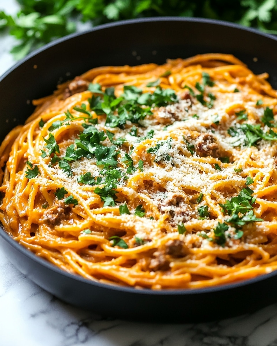 To reheat, I prefer warming the sauce gently in a skillet over low heat, stirring frequently and adding a little liquid as needed. Then toss in freshly cooked pasta or reheat pasta separately and combine before serving. This way, you preserve the creamy texture and avoid drying out the dish.